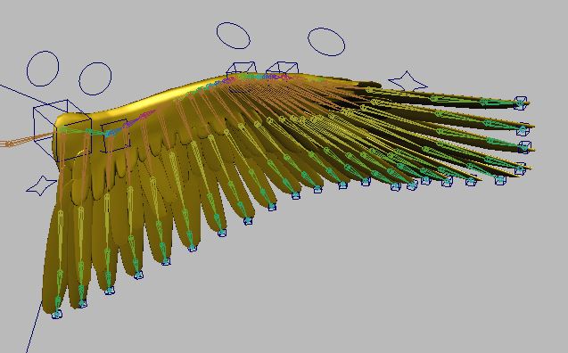 Many parts of the tutorial got quite technical, and things got overly complicated when I tried to key a wing fold using Set Driven Keys, but I realised that for the purpose of the project I didn’t need a full wing fold (maybe that’s for another day!) I split the wing into 4 sections, and using the Connection Editor used various control objects to control the rotation of each section of feathers. Then I did the same for each individual feather should I have needed to control the rotation of them separately.